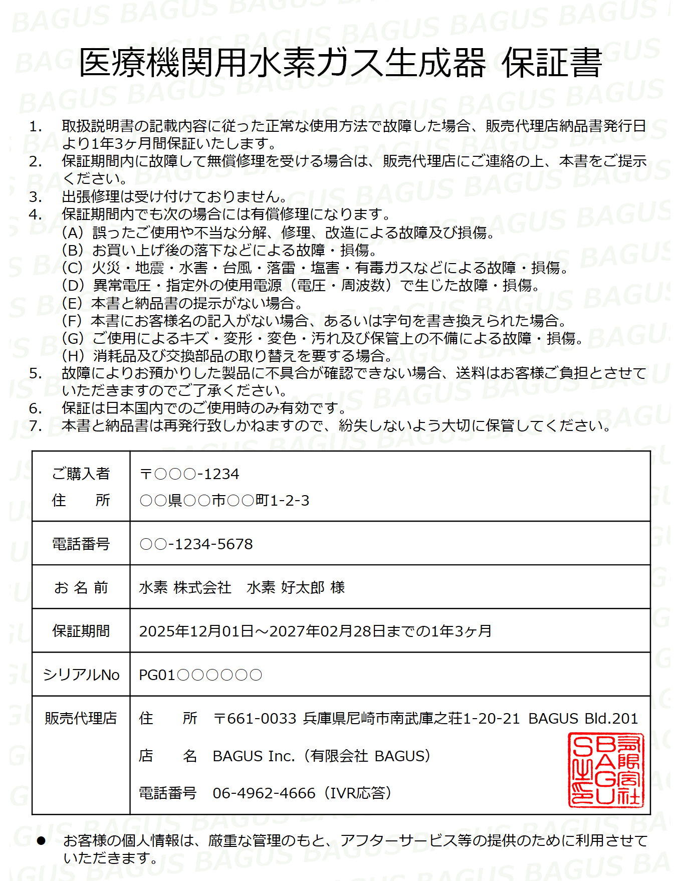 医療機関用水素ガス生成器の保証書は、